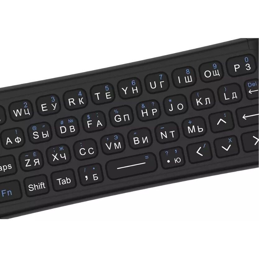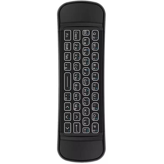 Тип подключения: беспроводной. Интерфейс подключения: USB 2.0. Тип беспроводной связи: инфракрасный режим, радиоканал. Частотный диапазон: 2,4 ГГц. Рабочее расстояние: до 10 м. Встроенный гироскоп/акселерометр: гироскоп. Совместимость: Android OS, Linux OS, Mac OS, Smart TV, Windows. Тип клавиатуры: компактная клавиатура с русской и английской раскладкой. Количество кнопок: 71. Количество программируемых кнопок: 1. Подсветка клавиатуры: да. Функция беспроводной мыши: да. Светодиодный индикатор: да. Встроенный микрофон: да. Дополнительная информация: возможность программировать кнопки ИК на другие устройства. Количество батареек: 2. Формат батареек: ААА. Материал корпуса: пластик/силикон. Цвет: черный. Размеры (ШхВхГ): 168х56х19 мм. Вес: 130 гр. Гарантия: 1 год. Срок службы: 3 года.