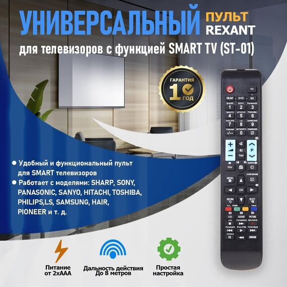 Универсальный пульт дистанционного управления REXANT для телевизора Samsung SMART TV отличается простотой в использовании и подходит для большинства современных моделей телевизоров этого бренда с функцией SMART TV. Пульт имеет минимальное количество кнопок (12) и эргономичный дизайн. Поддерживает все необходимые функции, обеспечивающие максимально полное и удобное управление телевизором. Питание устройства осуществляется от 2 батареек типа АА (в комплект не входят).