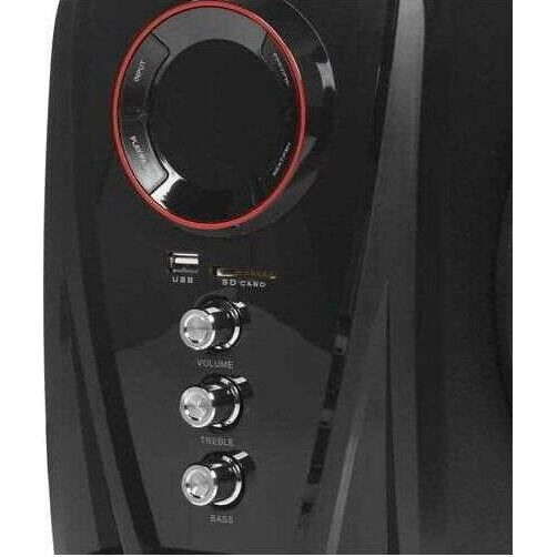 Мультимедийная акустическая система 2.1 с Bluetooth(v2.1), выходная мощность 40Вт (20Вт + 2х10Вт), аудиоплеер USB-flash, SD-card, FM-радио, пульт ДУ - 21 кнопка, стерео вход (2RCA), эквалайзер (обычный, джаз, рок, поп, классика), режимы MUTE, STANDBY, сабвуфер - дерево(MDF). Чувствительность - >68дБ. Диапазон частот - 40-20000Гц. Входные интерфейсы - USB 2.0, Стерео аудио (RCA). Выходные интерфейсы - Стерео аудио (RCA). Материал корпуса - МДФ, ABS пластик.