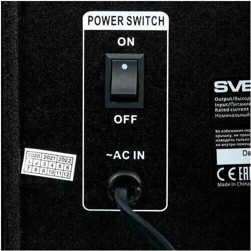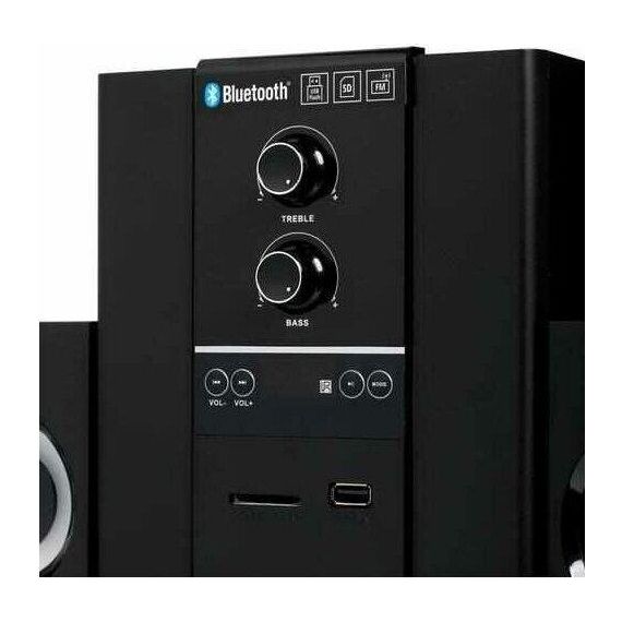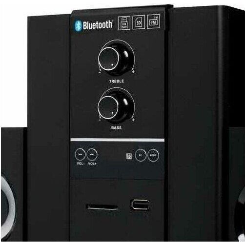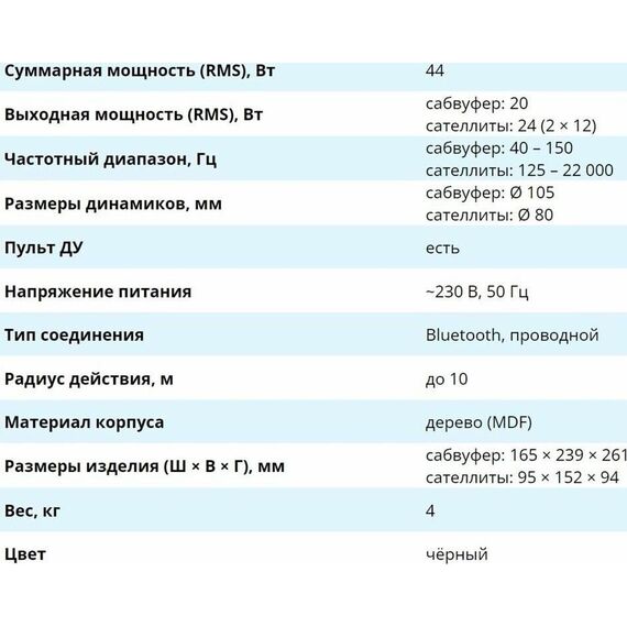 Выходная мощность (RMS), Вт: сабвуфер: 18/сателлиты: 22 (2х11), Частотный диапазон, Гц: сабвуфер: 40–150 / сателлиты: 150–20 000, Размеры динамиков, мм: сабвуфер: 105 / сателлиты: 80, Пульт ДУ, Напряжение питания: ~230 В, 50 Гц, Тип соединения: Bluetooth, проводной, Радиус действия, м: до 10, Материал корпуса: дерево (MDF), Суммарная мощность (RMS), Вт: 40.