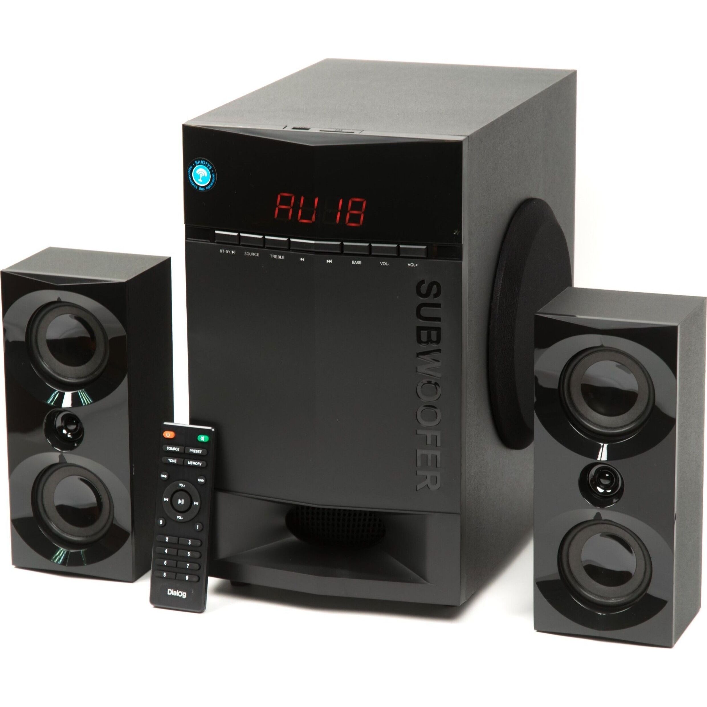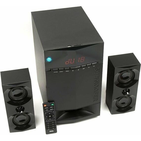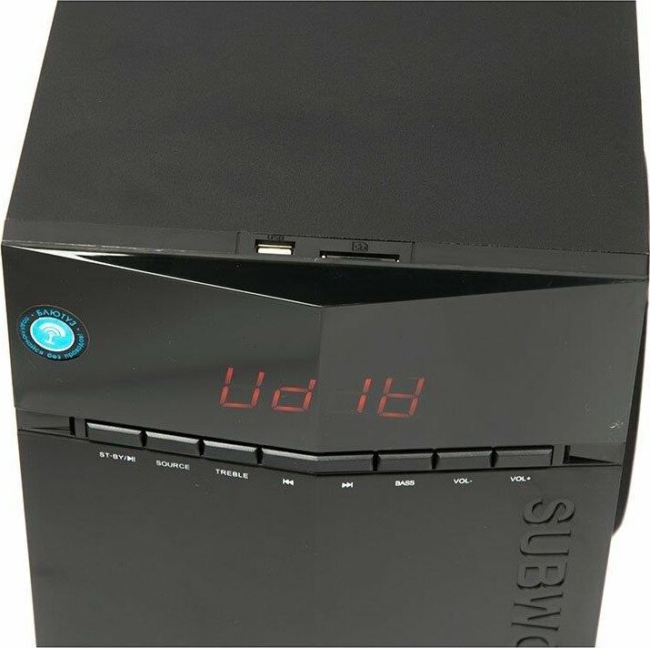Активная акустическая система 2.1. Поддержка карт SD (Secure Digital), USB, FM, Bluetooth. Мощность RMS (Вт): 65 (35+15+15). Усилитель: встроенный. Компоненты: сабвуфер, два сателлита, пульт ДУ. Входы: два стереовхода (2RCA): "AUX" и "DVD"; USB порт для флэш-накопителей; Слот для SD карт. Сабвуфер - 6,5". Частотный диапазон (Гц-Гц): от 40 Гц. Сопротивление (Ом): 4. Габаритные размеры (В*Ш*Г): 325*215*376 мм. Сателлиты - 2*3" + 1,5". Частотный диапазон (Гц-КГц): до 20 кГц. Сопротивление (Ом): 4. Корпус: 9 мм сабвуфер / 4 мм сателлиты. Длина сетевого кабеля: 1,5 м.