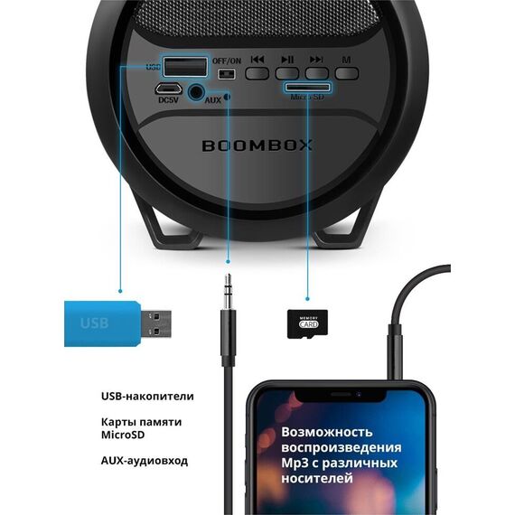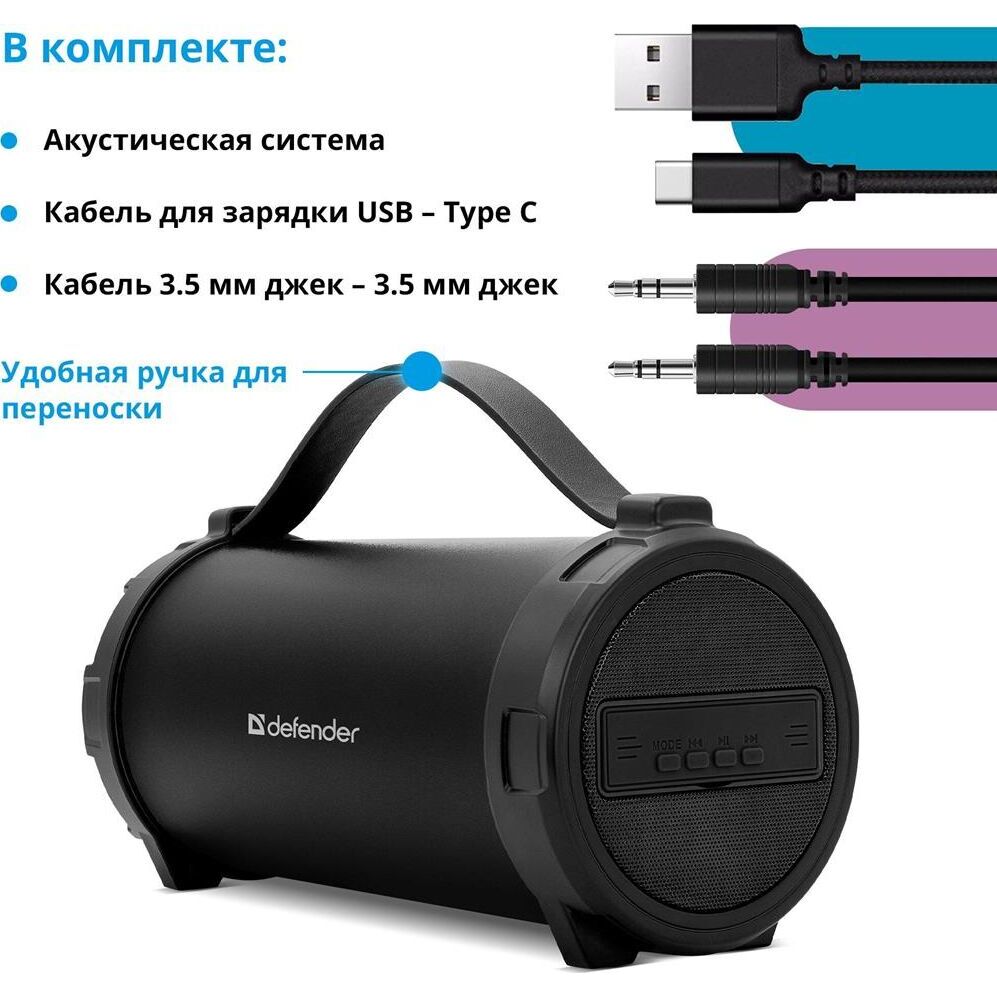 Портативная акустика, Bluetooth 5.0 , мощность (RMS) - 10 Вт, диапазон частот 70–20000 Гц , радиочастотный диапазон - 87.5–108.0 МГц, Li-Ion аккумулятор, емкость аккумулятора - 1500 мА·ч, встроенный FM-приемник, поддержка карт памяти Micro-SD, USB-флеш-накопителя, дополнительный AUX-аудиовход, ) акустику можно подключить к компьютеру (плееру, мобильному телефону) и использовать как мощный динамик, удобная ручка для переноски.