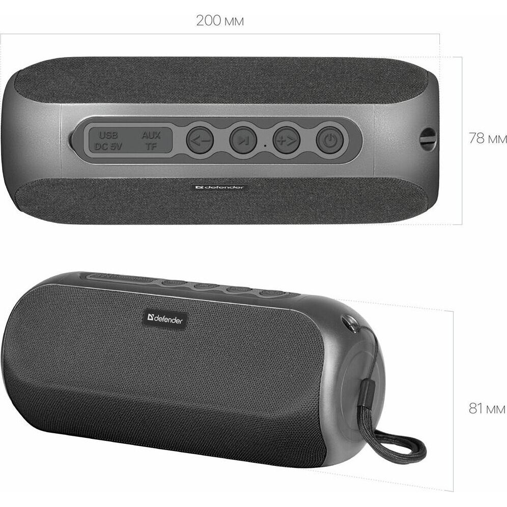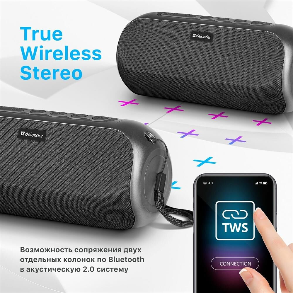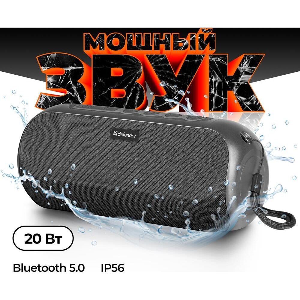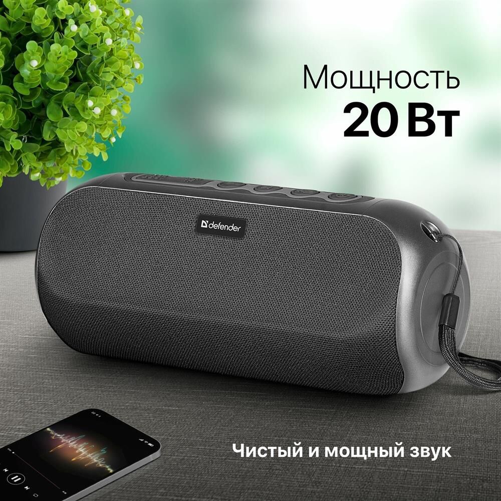 Портативная колонка, Bluetooth 5.0, мощность (RMS) - 20 Вт, диапазон частот 85–20000 Гц, соотношение сигнал/шум - 80 дБ, время работы от аккумулятора 8 час, дополнительный AUX-аудиовход, Питание USB, 5 В , Li-Ion аккумулятор, емкость аккумулятора - 1800 мА·ч, встроенный FM-приемник, радиочастотный диапазон 87.5–108.0 МГц, поддержка USB-накопителей и MicroSD-карт, встроенный MP3-плеер,True Wireless Stereo (TWS) — возможность сопряжения двух отдельных колонок по Bluetooth в акустическую 2.0 систему