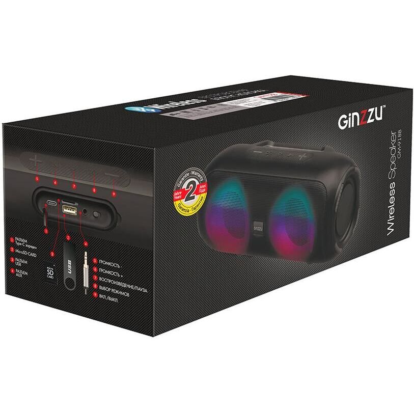 Динамическая RGB подсветка. Bluetooth: V5.0. FM радио - 87,5-108 МГц. Аудио-плеер: USB-flash, микро SD. Режим TWS. Вход AUX: 3,5 мм DC-джек. Аккумулятор 3.7 В, 3600 mAh.
