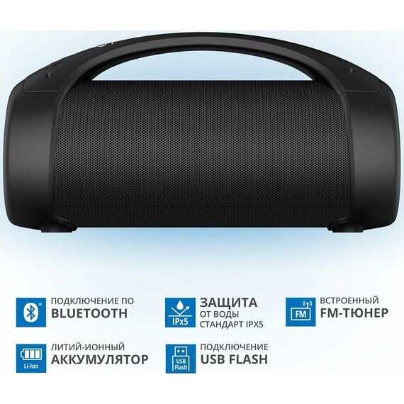 Выходная мощность (RMS), Вт 40 (2 ? 20) Частотный диапазон, Гц 70 – 20 000 Диапазон частот тюнера, МГц 87.5 – 108 Размеры динамиков, мм O 70 Беспроводная передача сигнала по Bluetooth да Воспроизведение музыки с носителей памяти USB Источник питания литий-ионный aккумулятор: 3600 мA · час (2 шт.) USB: DC 5 V Тип соединения Bluetooth, проводной Поддерживаемые профили Bluetooth HSP, HFP, A2DP, AVRCP Радиус действия, м до 10 Размеры изделия, мм 360 ? 147 ? 190 Вес, г 2500 Цвет черный