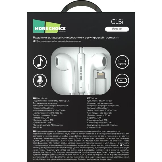 Наушники вкладыши More choic G15i имеют контроллер с микрофоном, который освобождает ваши руки при входящем вызове от удержания смартфона. Функциональное управление двумя кнопками- ответ на вызов, пауза, переключение аудио, регулировка громкости. Наушники предназначены для разговора и для воспроизведения любых аудиофайлов. Совместимость со всеми телефонами и другими гаджетами (планшет, компьютер, иные источники объемного звука), имеющими аудио разъем Lightning 8-pin, Сопряжение Bluetooth. Кабель: TPE, Длина кабеля: 1,2 м Частотный диапазон: 20-20000 Гц, Чувствительность: 100дБ 3дБ, Импеданс: 32 Ом.Комплектация: наушники, держатель для смартфона, буклет.