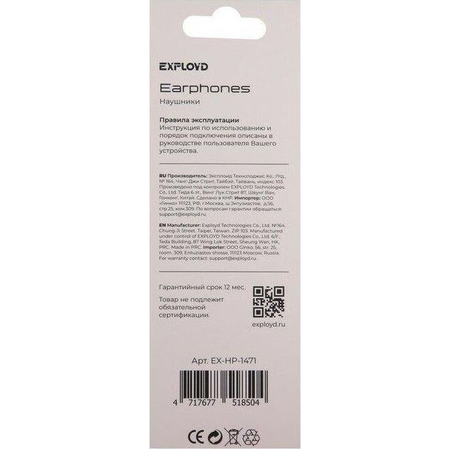 Наушники EXPLOYD (EX-HP-1471) 3.5mm/белый/1.2М/Easy