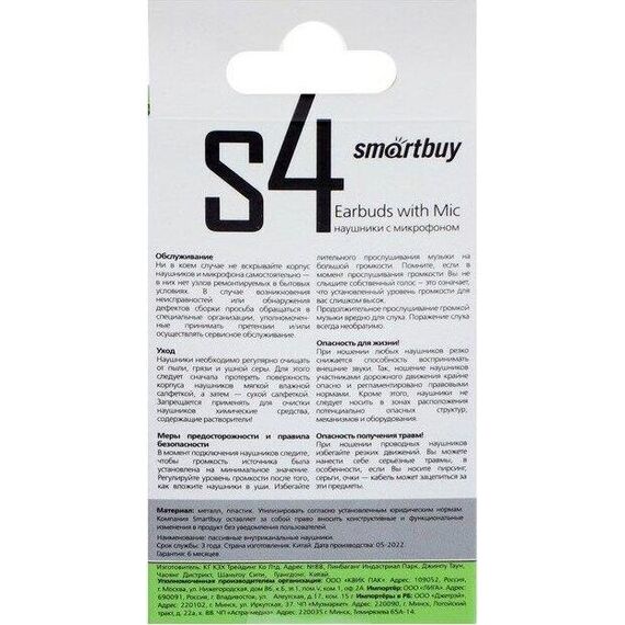 Наушники-гарнитура SMARTBUY (SBH-012) S4 белый (цветной пакет)