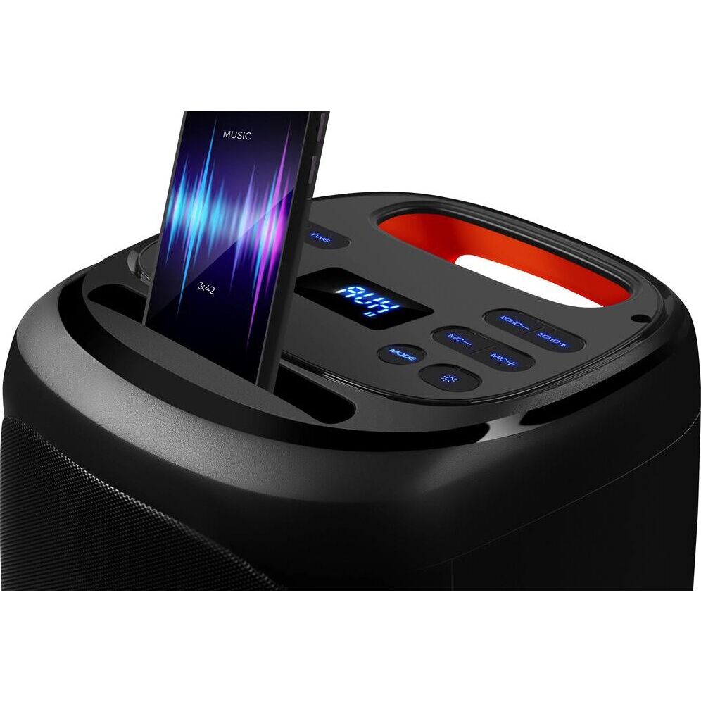 Тип акустической системы: активная Серия: для вечеринок Звуковая схема: моно, 1.1 Количество полос: 2 Широкополосный динамик: 6.5 " ВЧ твитер: 1.5 " Сопротивление динамиков: 4 Ом Сопротивление ВЧ твитера: 8 Ом Материал диффузора динамиков: целлюлоза Акустическое оформление: фазоинверторного типа Расположение порта фазоинвертора: тыл Суммарная выходная мощность (RMS): 50 Вт Соотношение сигнал/шум: 75 дБ Диапазон частот: 90–20000 Гц DSP-процессор: есть Эквалайзер: Pop, Rock, Jazz, Classical, Normal, Country Интерфейс беспроводной связи: Bluetooth 5.0 Дальность действия: 10 м Время автоматического отключения питания колонки при разъединении Bluetooth-соединения: 10 мин True Wireless Stereo (TWS): есть Дисплей: есть Пульт ДУ: нет Интерфейс: AUX-аудиовход Подсветка: светодиодная Световые эффекты: есть Количество световых режимов: 4 Функция выключения подсветки: есть Питание: от USB, 5 В , Li-Ion аккумулятор Напряжение аккумулятора: 7.4 В