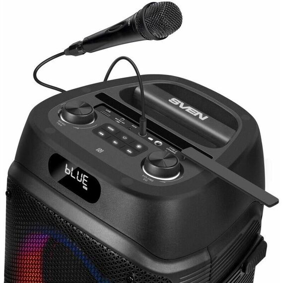 Выходная мощность 100 Вт . Приложение «SVEN SOUND» для управления портативной акустикой. Передача сигнала по Bluetooth Динамическая отключаемая RGB подсветка Беспроводное подключение двух колонок к одному источнику звука (TWS) Микрофонный вход для караоке Регулировка уровня эха караоке микрофона Аудиовход для подключения электрогитары .Проводной микрофон в комплекте Быстрое подключение по Bluetooth с помощью NFC FM-радио. LED дисплей Воспроизведение музыки с USB flash и microSD карт памяти Ручка для переноски Время работы до 28 часов Встроенная подставка для смартфона Вход AUX для подключения источника звука Функция эквалайзера Возможность горизонтального и вертикального расположения Пульт ДУ . Литий-ионный aккумулятор: 7.4В, 8000мА*ч