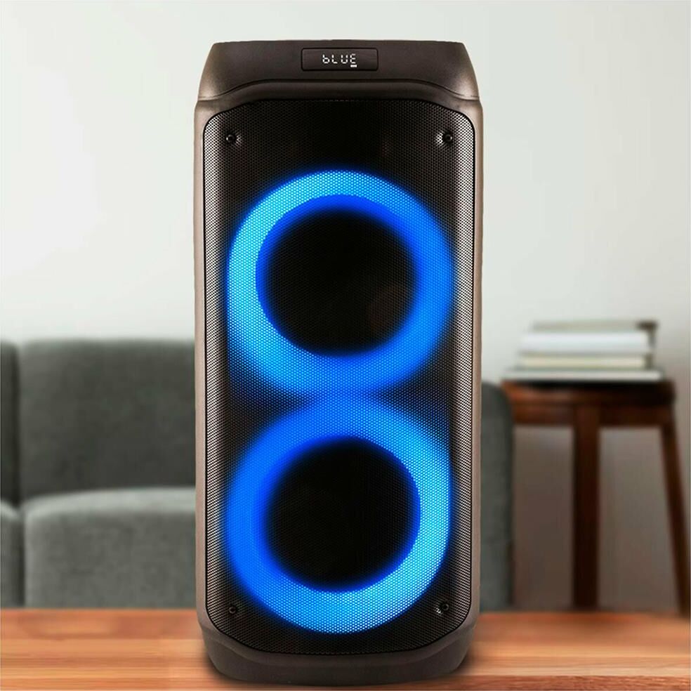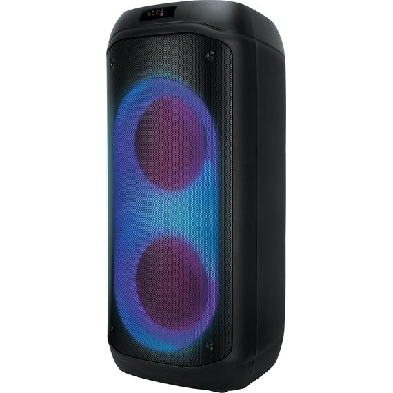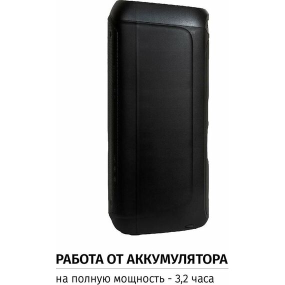 Акустическая система с Bluetooth, FM радио, и TWS. Выходная мощность (RMS), 100Вт, Частотный диапазон: 50Гц-20кГц, Диапазон частот FM тюнера: 87.5 - 108 МГц, 6 цветовых схем подсветки, 7 цветная светодиодная, Размеры динамиков низкочастотный динамик - 203мм x2, твитер -25мм. Беспроводная передача сигнала по Bluetooth, Воспроизведение музыки с носителей памяти - USB, TF card, Вход: для микрофона, USB, AUX, TF card. Функция караоке, Функция регулировки эквалайзера, Функция TWS, Встроенная аккумуляторная батарея 7000 мAч, Пульт управления, Размеры: 340*340*740мм, Вес: 11,5кг