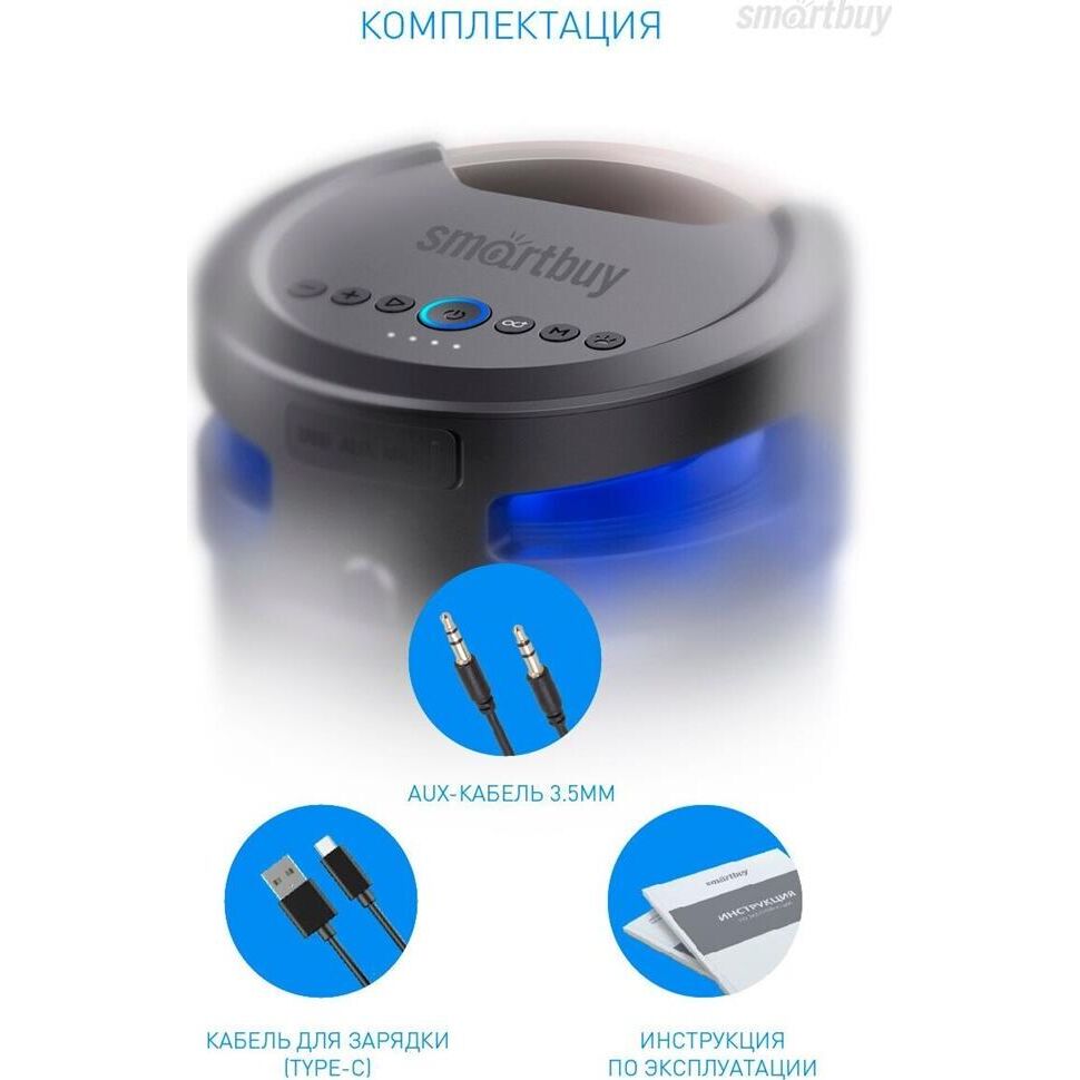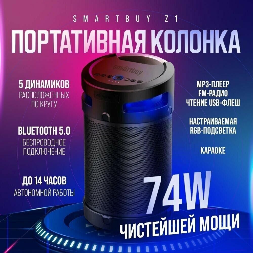 Акустическая система, Круговая архитектура динамиков – звук распространяется на 360°. Архитектура 4: 1 4 широкополосных динамика и 1 сабвуфер; Суммарная мощность 74 Ватт; настраиваемая RGB-подсветка; Встроенная батарея 440 мАч/ 7,4 В; До 14 часов беспрерывной работы на одном заряде; Bluetooth; MP3-плеер; FM-радио; AUX; TWS - возможность объединения в стереопару; MIC - вход для микрофона; Размеры 215 * 215 * 387 мм; вес 4800 г.