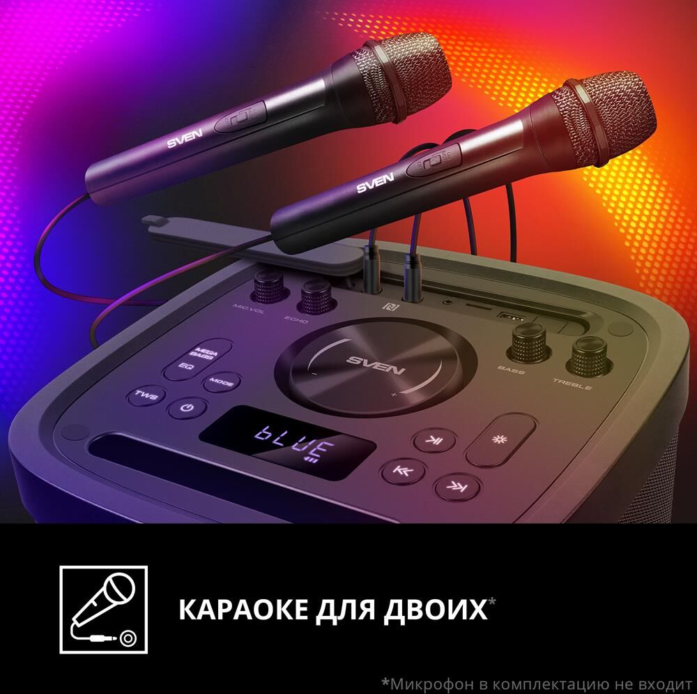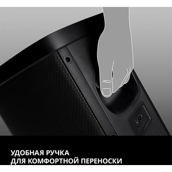 Выходная мощность 150 Вт Передача сигнала по Bluetooth Динамическая отключаемая RGB подсветка Беспроводное подключение двух колонок к одному источнику звука (TWS) Два микрофонных входа для караоке Регулировка уровня эха караоке микрофона FM-радио* Быстрое подключение по Bluetooth с помощью NFC** LED дисплей Воспроизведение музыки с USB flash и microSD карт памяти Стробоскоп Ручка для переноски Время работы от батареи до 20 часов Встроенная подставка для смартфона Вход AUX для подключения источника звука Функция эквалайзера Пульт ДУ Функция усиления баса