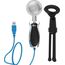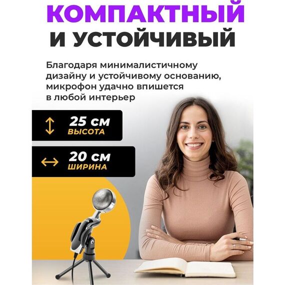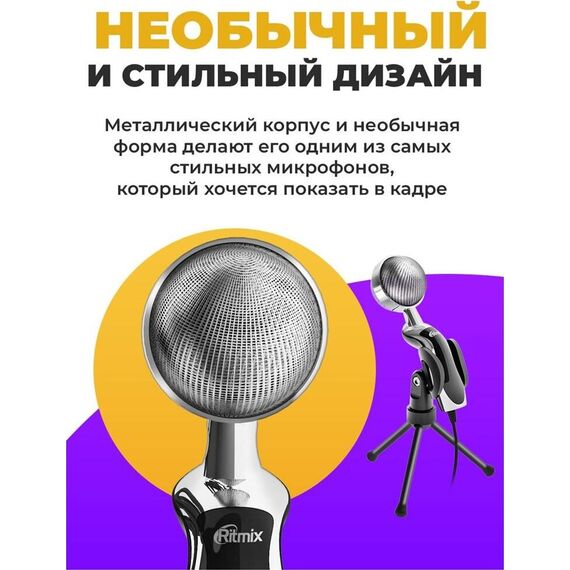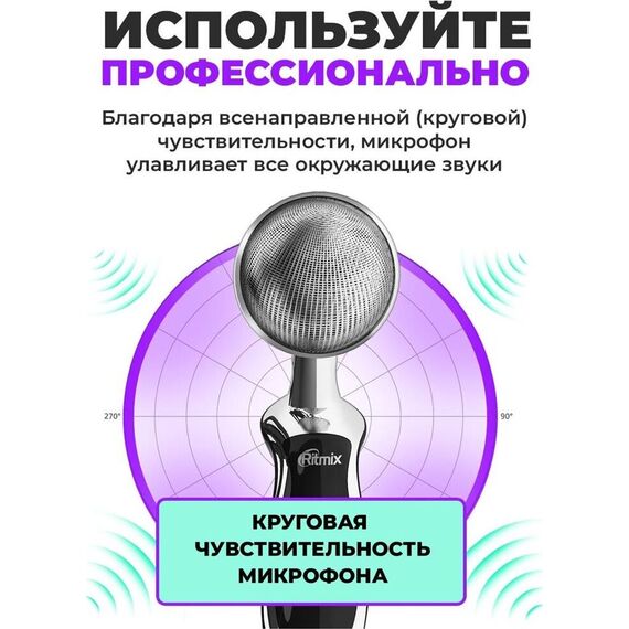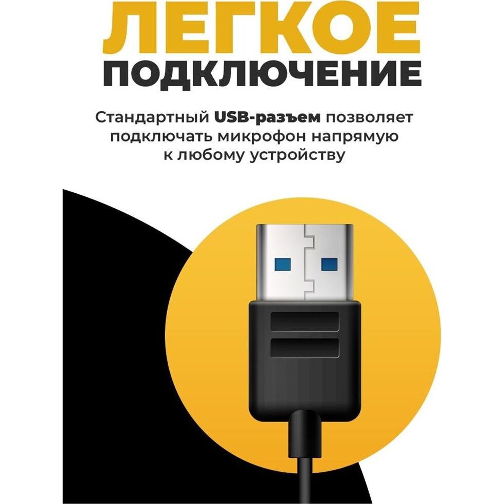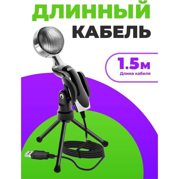 Микрофон на штативе-подставке, диапазон частот микрофона 50 - 16 000 Гц, сопротивление микрофона - 2,2 кОм, чувствительность микрофона -30 ± 3 дБ, выходы 3,5мм, длина кабеля -1,5 м.