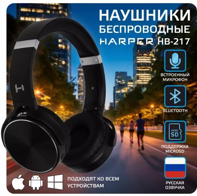Наушники беспроводные HARPER HB-217 BLACK (BLUETOOTH, с микрофоном, MICROSD, MP3-плеер)