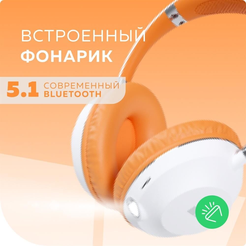 Bluetooth-наушники накладные Smart 5.1 400mAh More choice HW34S с фонариком Производитель More choice; Совместимость ПК, планшеты, смартфоны, MP3-плееры; Версия Bluetooth 5.1; Время работы в режиме bluetooth 10 ч; Время в режиме ожидания 100 ч; Время работы 10 ч; Дальность действия до 10 м; Регулятор громкости есть; Конструкция Накладные; Тип наушников Bluetooth-наушники; Частотный диапазон 20 - 20000 Гц; Чувствительность 85 дБ; Импеданс н 40 Ом; Материал корпуса ABS-пластик, искусственная кожа; Разъем miniJack 3.5 мм, Type-C; Микрофон есть; Страна бренда Россия; Страна производитель н Китай; Комплектация н Наушники, кабель для зарядки, аудиокабель AUX, буклет, держатель для наушников, инструкция; Цвет бело-оранжевый