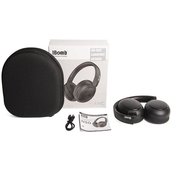 Беспроводные полноразмерные наушники IBomb N50 - это качественный товар для любителей хорошего звука. Ёмкий аккумулятор в 400мАч обеспечивает около 20 часов беспрерывной работы. Также IBomb N50 могут работать в проводном режиме через AUX-IN и поддерживают функцию гарнитуры. Это делает их универсальным помощником для прослушивания музыки с любых устройств. Одно из главных достоинств модели — активное шумоподавление (ANC). Полноразмерные наушники снижают уровень окружающего шума низкой и средней частоты на 92%. Вам остается только чистый звук и возможность получить удовольствие от прослушивания музыки, книги или общения без посторонних шумов. Включается шумоподавление кнопкой на корпусе наушников. Еще одно преимущество IBomb N50 - это высокая верность звучания (звук в формате Hi-Fi). Устройство направленно на то, чтобы звуки звучали максимально точно и качественно. Наушники оснащены самой современной версией блютуз - Bluetooth 5.3. Их очень удобно брать с собой