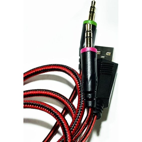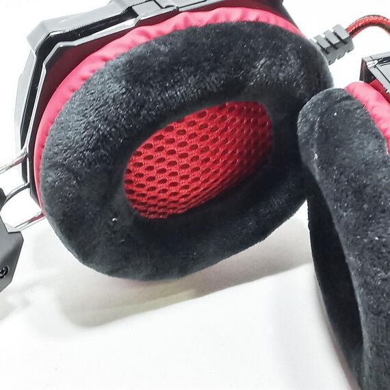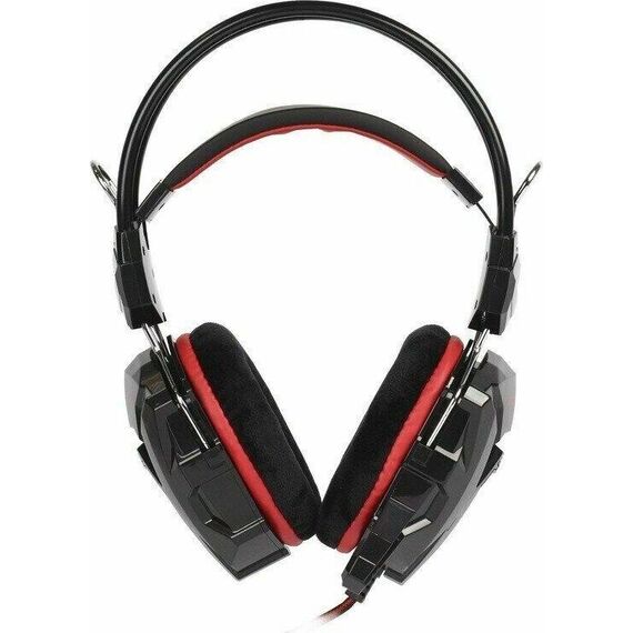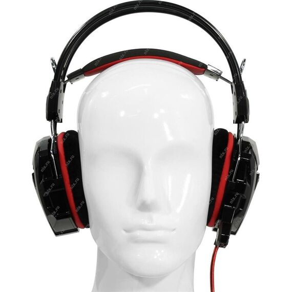 Полноразмерная проводная игровая гарнитура с подстветкой. Велюровые амбушюры и мягкое оголовье обеспечат комфорт во время самых напряженных баталий. Дублирующие оголовье рейки обеспечат лучшее прилегание, которое позволит сосредоточиться только на игре. А регулируемые по высоте металлические направляющие обеспечат прочность изделия. Диаметр динамиков: 40 мм. Частотный диапазон наушников: 18 Гц — 20 кГц. Чувствительность наушников - 103 дБ. Чувствительность микрофона - 58 дБ. Крепление микрофона: на левой чашке наушников. Управление: уровень громкости / отключение звука. Длина кабеля: 2.2 м. Объемный звук. Усиленная звукоизоляция. Мягкое оголовье идеально подходит для долгой игры. Сверхчувствительный микрофон. Прочный кабель. LED подсветка. Интерфейс соединения - 2 х 3,5мм + USB (для подсветки).