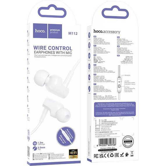 Hoco M112 это универсальные проводные наушники, которые обеспечивают отличное качество звучания и максимальную степень комфорта. Они совместимы со всей современной электроникой - плеерами, телефонами, компьютерами, имеющими разьем AUX 3.5 мм.Чувствительный микрофон и простое управление обеспечивают удобство при разговоре. Вакуумные наушники имеют вкладыши анатомической формы, за счет этого наушники надежно сидят в ушах и не причиняют никаких неудобств, даже при длительном использовании. Обладают качественным звуком и стильным минималистичным дизайном. На кабеле находится пульт управления с микрофоном и кнопкой для ответа на звонки/воспроизведения музыки. Длина кабеля: 1,2 м; вес: 10 г.