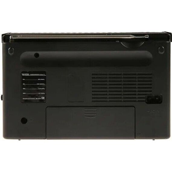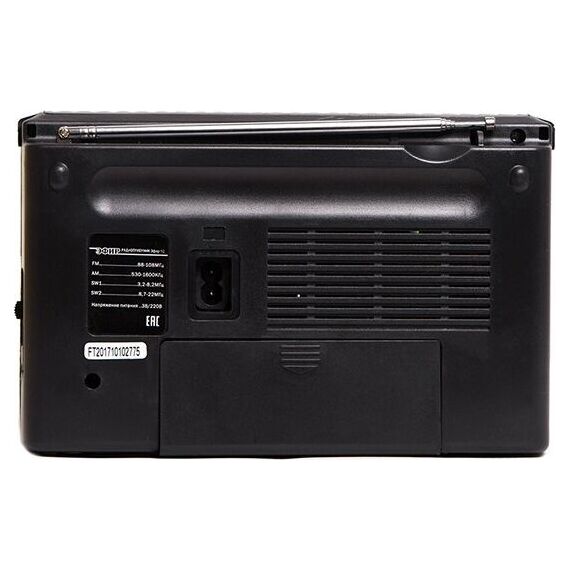 Тюнер аналоговый, диапазоны/частоты FM 88-108МГц, AM 530-1600КГц, SW1 3,2-8,2МГц, SW2 8,7-22,0МГц, 1 динамик, мощность динамика Ф76mm/4Ом/3W, питание 220В, батарейки R20*2шт (не в компл), размер 210х73х145мм, телескопическая антенна, разъем под наушники, ручка для переноски.