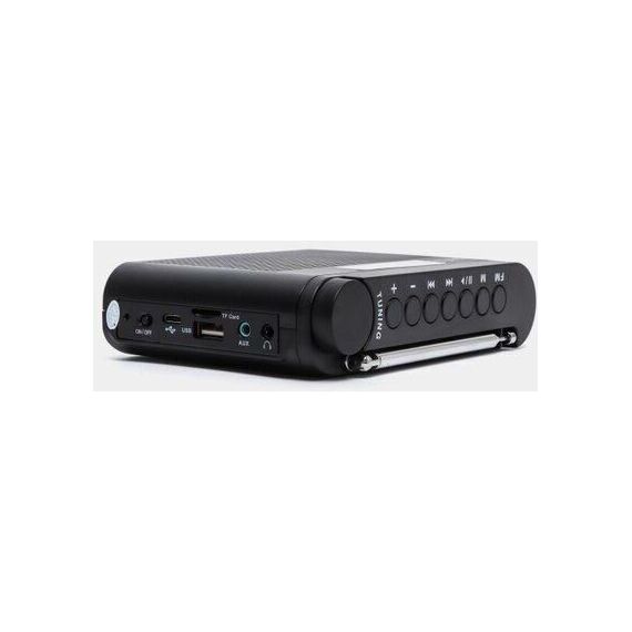 Радиоприемник в классическом корпусе имеет стильный внешний вид, удобное колесико-регулятор радиоволны и кнопки управления на верхней грани устройства. Поворотная телескопическая антенна принимает сигнал в 2-х самых популярных диапазонах (УКВ и FM), также предусмотрена возможность выборочного запоминания 10 станций. Есть встроенный MP3-плеер, который воспроизводит MP3-файлы с карты памяти microSD или USB-накопителя. Аудиовход AUX, разъем для наушников и поддержка режима USB-аудио расширяют функционал приемника. Диапазон воспроизводимых частот: 90–18000 Гц. Выходная мощность: 3+3=6 Вт (RMS). Аккумуляторная батарея: встроенная 1800 мАч (питание от USB). FM-радио: 65,9–74 УКВ / 87,5–108 FM. Габаритные размеры: 140х33х100 мм. Вес: 270 г.