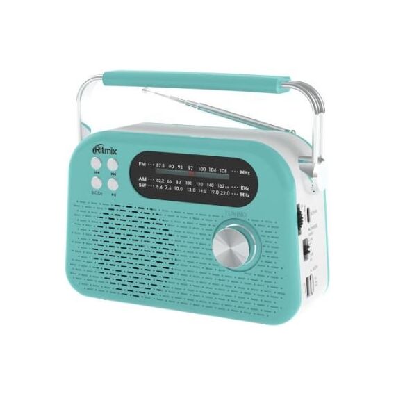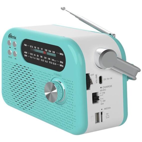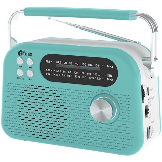 Портативный трёхдиапазонный радиоприёмник с ручкой для переноски. Поддержка Bluetooth v.5.4 и режима MP3, воспроизведение с USB/micro SD карт, питание USB Type-C, сменный аккумулятор на 1200 мАч