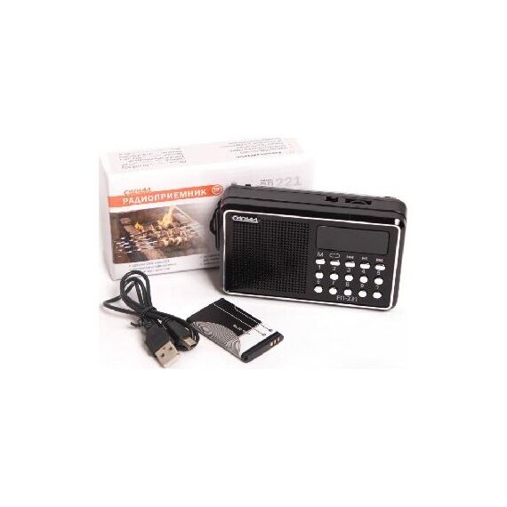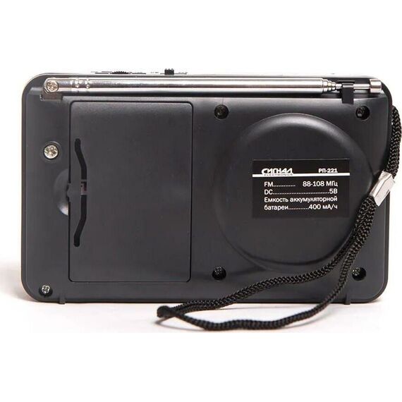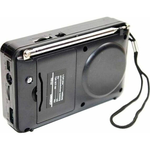 Цифровой тюнер, FM диапазон (FM-64-108МГц), автонастройка в FM диапазоне на 34 станции, 1 динамик (монозвучание) мощностью Ф57mm/4Ом/3W, питание 5В, аккумулятор типа BL-5C, емкостью 400мА/ч, размер 114*33*73мм, дисплей, воспроизведение с USB, microSD (TF), разъем для внешнего питания 5В, телескопическая антенна, разъем под наушники, ручка для переноски.