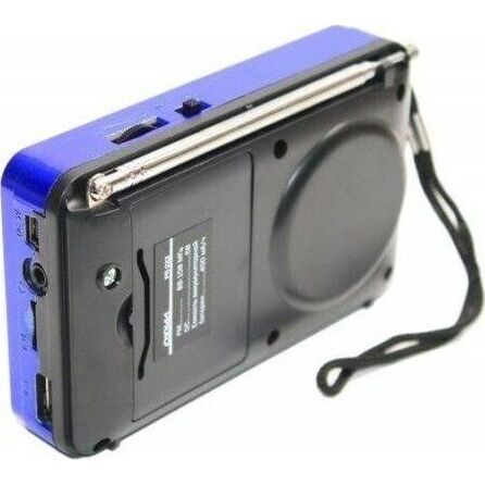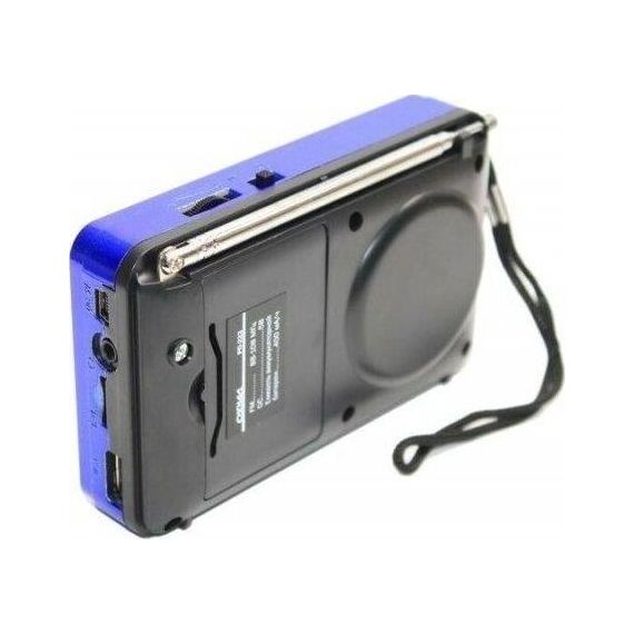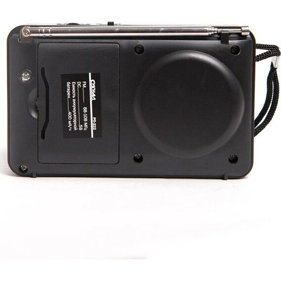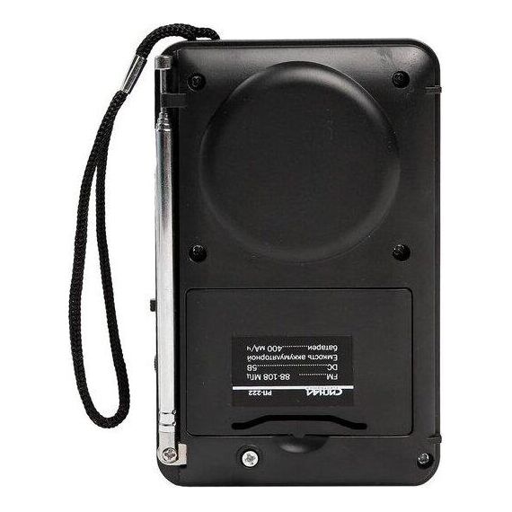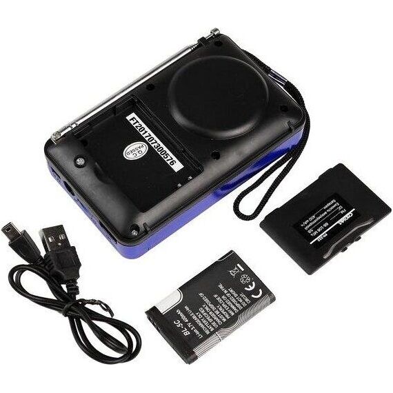 Цифровой тюнер, FM диапазон (FM-88-108МГц), автонастройка в FM диапазоне на 35 станций, 1 динамик (монозвучание) мощностью Ф57mm/4Ом/3W, питание 5В, аккумулятор типа BL-5C, емкостью 400мА/ч, размер 114*33*73мм, дисплей, возможность воспроизведения с USB, microSD (TF), разъем для внешнего питания 5В, телескопическая антенна, разъем под наушники, ручка для переноски.
