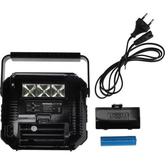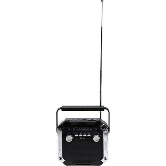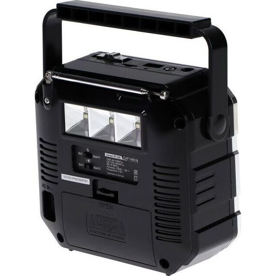 Аналоговый тюнер, УКВ/СВ/КВ диапазоны (УКВ-64-108МГц, СВ-530-1606КГц, КВ-8,0-18,0 МГц), 1 динамик (монозвучание) мощностью Ф77MM/8Ом/3W, питание 220В, аккумулятор типа 18650, емкостью 1200мА/ч, размер 150*68*130, возможность воспроизведения с USB, microSD (TF), AUX, разъем для внешнего питания 5В, 1 встроенный фонарь 0,15Вт, телескопическая антенна, функция памяти воспроизводимой записи, функция дискосвета, ручка для переноски.