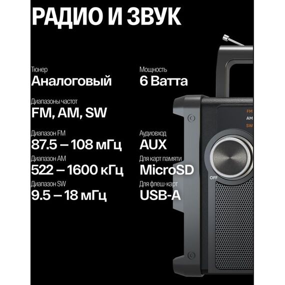 ПОРТАТИВНЫЙ РАДИОПРИЕМНИК Диапазоны частот: FM/AM/SW FM: 87.5 – 108 МГц AM: 522 – 1600 кГц SW: 9.5 – 18 МГц Воспроизведение аудио по Bluetooth 5.0 Встроенная батарея: 900 мАч Выходная мощность: 6 Вт Поддержка аудионосителей: USB/TF (до 32 ГБ) Воспроизведение формата MP3 Аудиовход AUX-in (3.5 мм jack) Встроенный фонарик Питание: от батарей D (UM-1)*2 шт. (в комплект не входят) Цвет: черный с серым