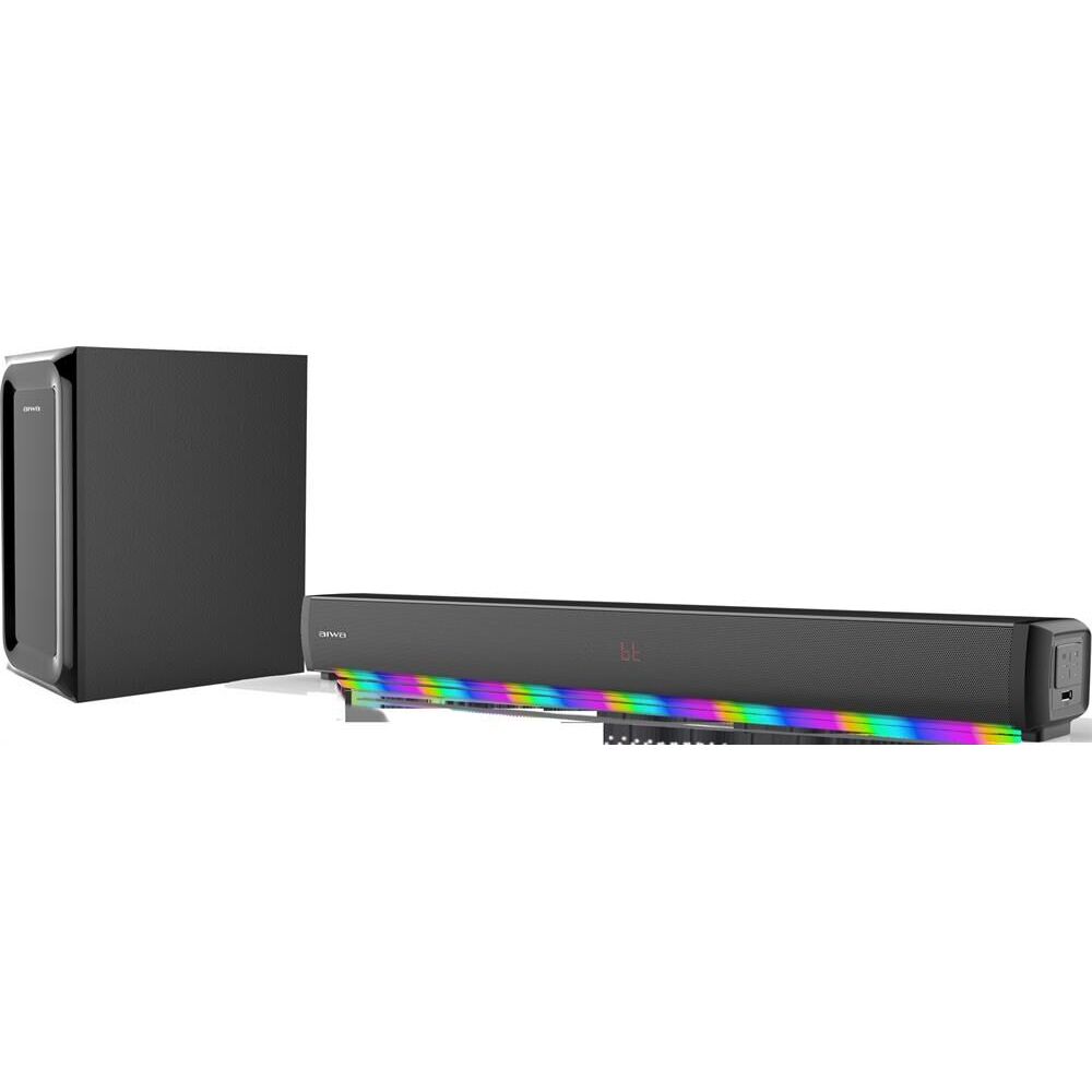 2.1 Саундбар с LED подсветкой и беспроводным сабвуфером, 450Вт Максимальная выходная мощность, 90 Вт Выходная мощность RMS, сопротивление 4Ом, 6.5" Беспроводной сабвуфер Разноцветная LED подсветка звуковой панели с 7-ю режимами работы, Беспроводная передача сигнала по Bluetooth, Цифровой HDMI (ARC) и Optical вход, Аудио форматы: MP3/WMA/FLAC/WAV, LED дисплей, Пульт управления, Поддержка воспроизведения с USB накопителя, Линейный вход, Размер звуковой панели: 941 x 80 x 88 мм, Размер сабвуфера: 192 x 310 x 375 мм