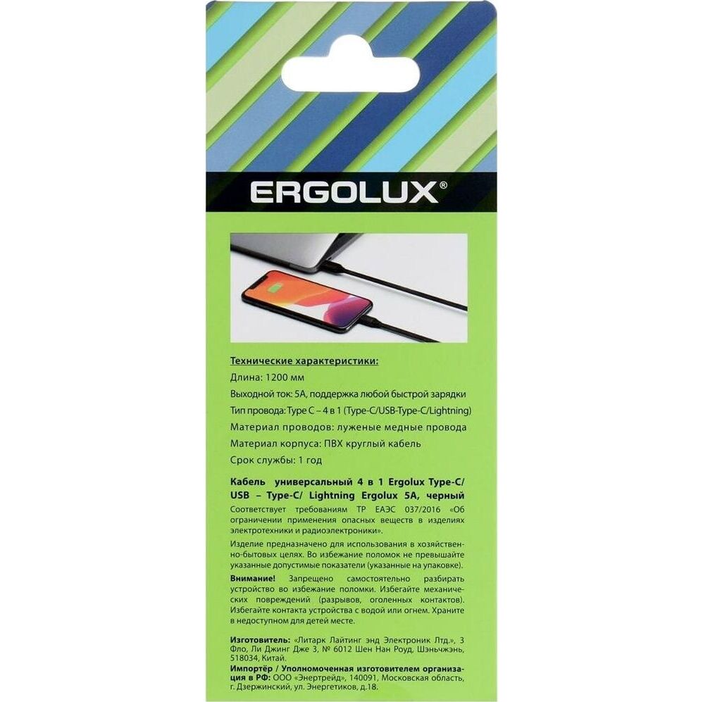 • Тип провода: 4 в 1 (USB/Type C-Type C/Lightning) • Сила тока: 5А • Мощность: 60Вт • Быстрая зарядка • Кабель для зарядки + передача данных • Длина кабеля: 120 см • Материал: PVC оплётка + силикон • Цвет: Черный • Упаковка: Коробка