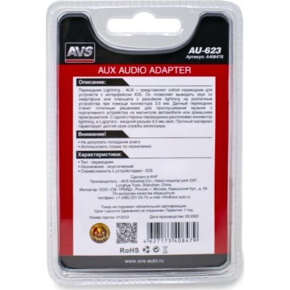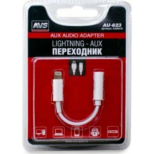 Переходник Lightning — AUX AVS AU-623- представляет собой переходник для устройств с интерфейсом IOS. Он позволяет выводить звук со смартфона или планшета с разъёмом lightning на различные устройства при помощи коннектора 3.5мм. Данный переходник станет отличным решением для прослушивания музыки с портативного устройства на магнитоле автомобиля или домашнем проигрывателе. С одной стороны переходник расположен коннектор lightning, а с другого — входной разъем 3.5мм. Jack. Прочная материал гарантирует долгий срок службы аксессуара.