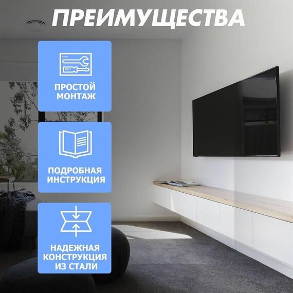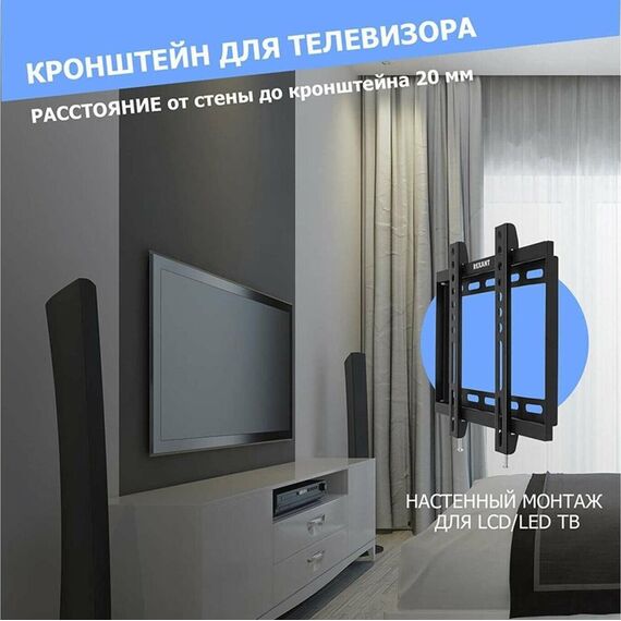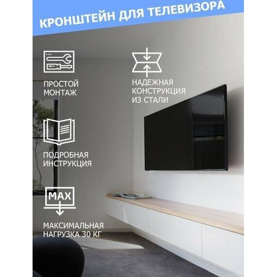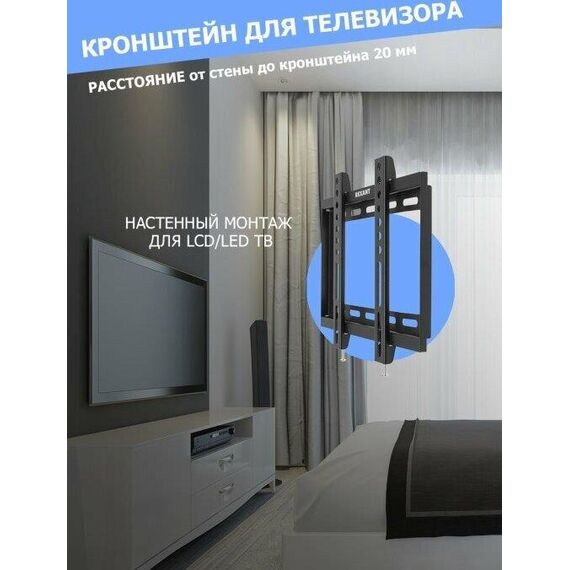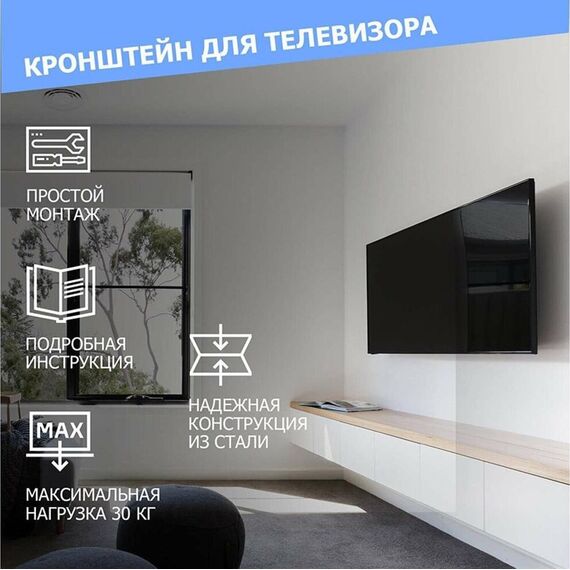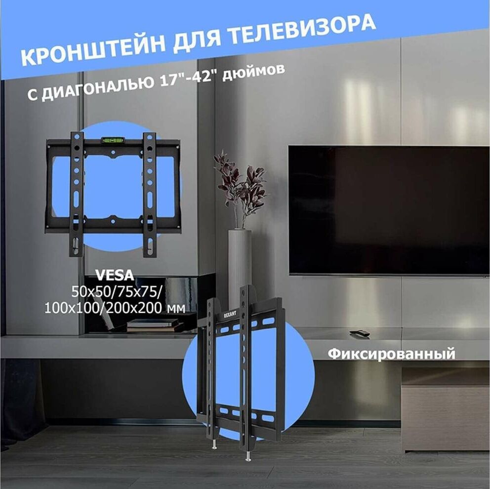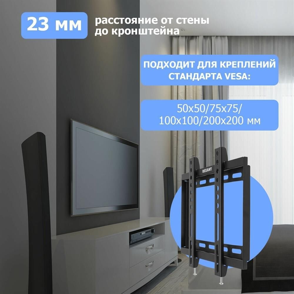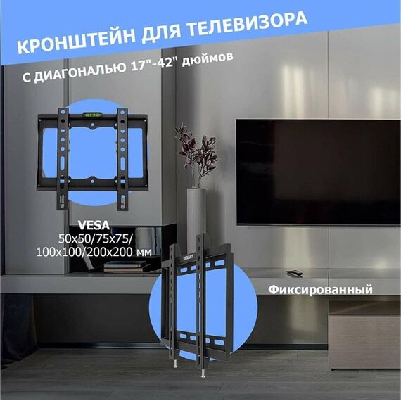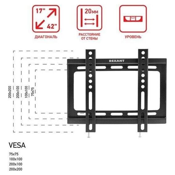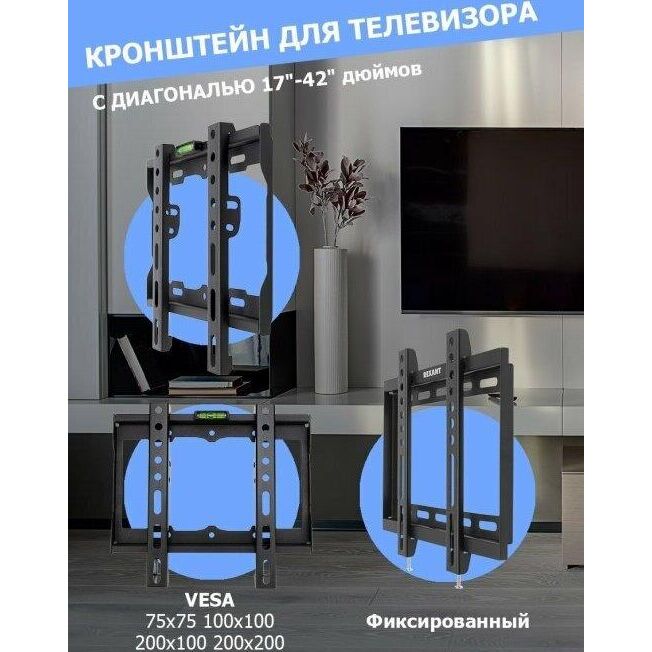 "Кронштейн для телевизора. Тип: фиксированный Назначение: телевизионный Цвет: черный Мин. диагональ: ТВ 17 Макс. диагональ: ТВ 42 Максимальный вес оборудования: 25 кг Установка: настенный Расстояние от стены до кронштейна: 23 мм VESA: 50x50/75x75/100x100/200x200 мм"