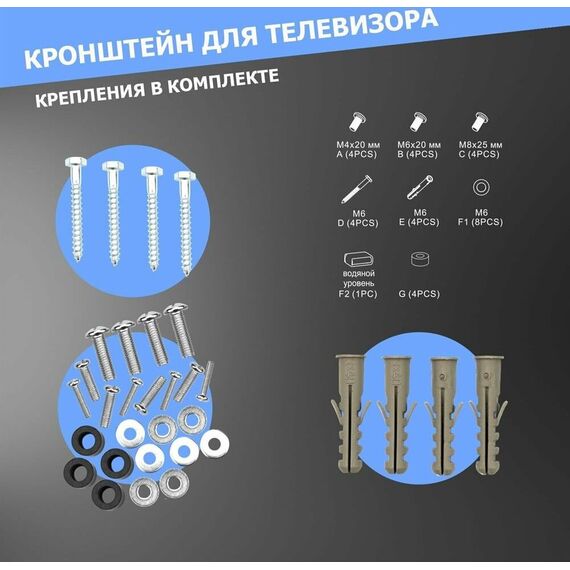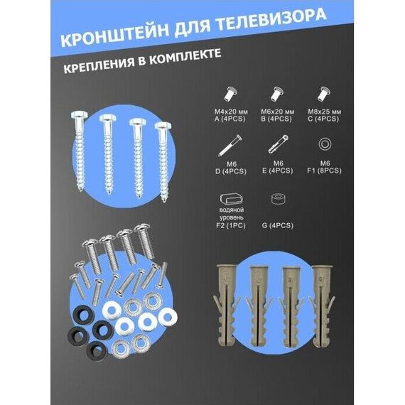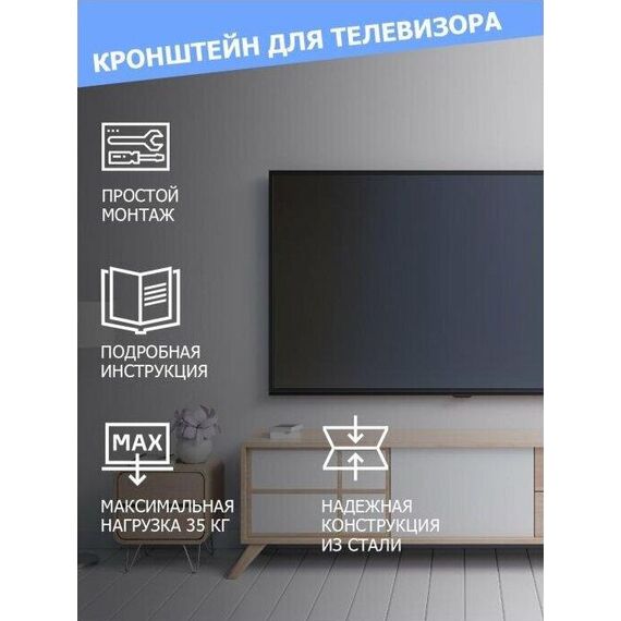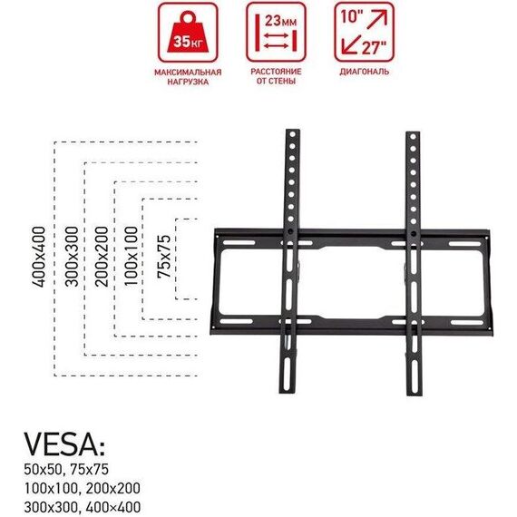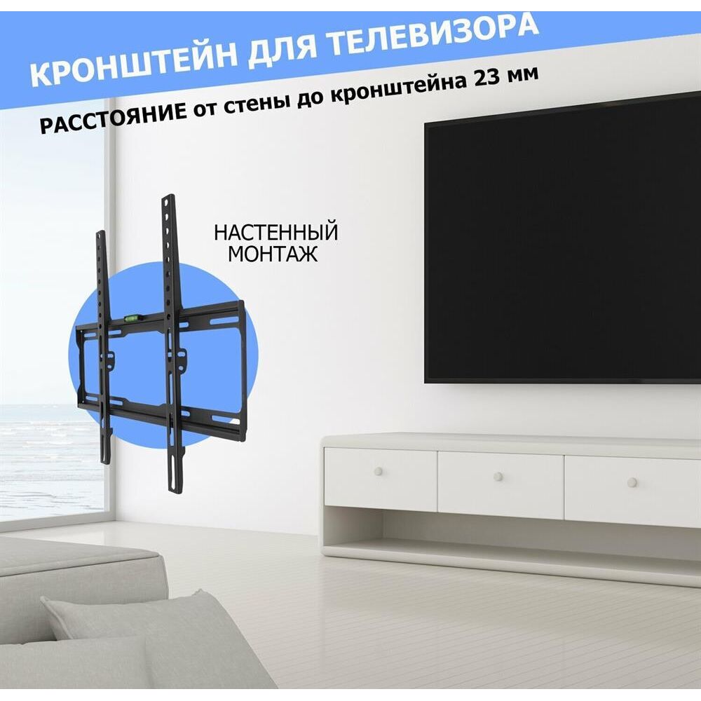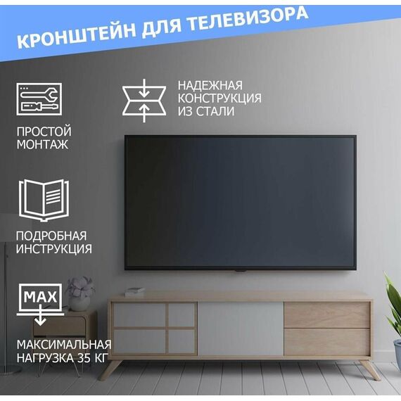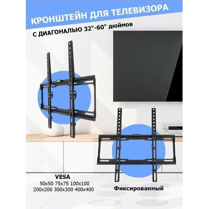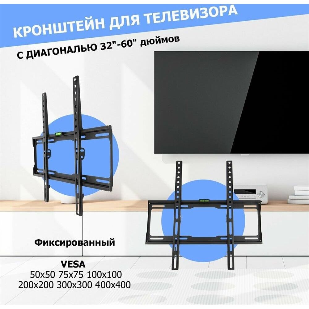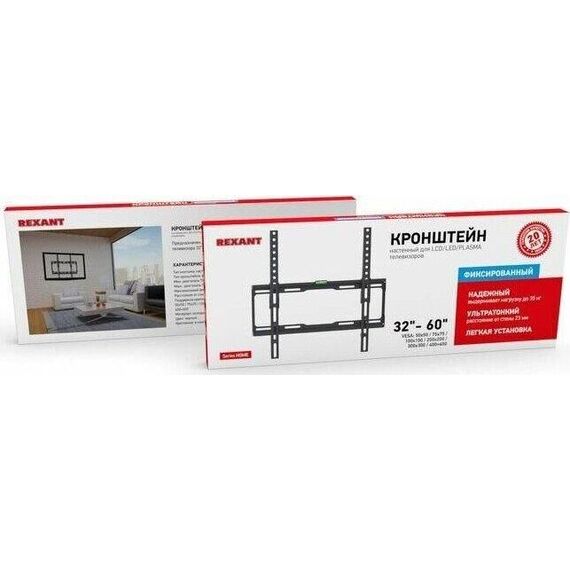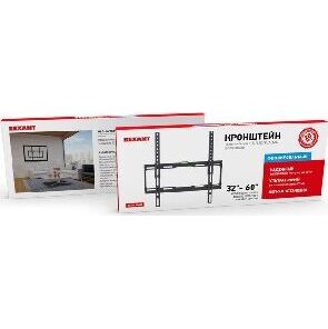 Кронштейн на стену для телевизора, диагональю: 32"-60 " дюймов, REXANT серия HOME Тип: фиксированный Назначение: для LED/LCD/PLASMA тел-в Цвет: черный Мин. диагональ: ТВ 32 дюймов Макс. диагональ: ТВ 60 дюймов Максимальный вес оборудования: 35 кг Тип монтажа: настенный Расстояние от стены до кронштейна: 23 мм Поддержка крепления стандарта VESA: 50x50/75х75 /100х100/200x200/300x300/400x400 Крепление: в комплекте.