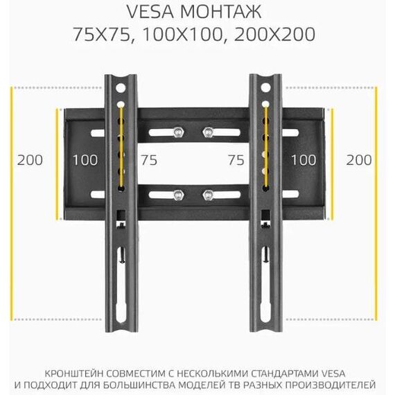 Назначение: для LCD- и LED-телевизоров. Совместимость с диагональю ТВ: 16, 24, 32, 40, 42, 43. Тип кронштейна: фиксированный. Совместимость: поддерживает ТВ с диагональю 16-43. Максимальный вес ТВ: 30 кг. Крепление стандарта Vesa: до 200х200. Типы VESA: 100x100, 200x200, 75x75. Угол наклона: 0°. Масштабирование по горизонтали: да. Материал корпуса: сталь. Минимальное расстояние от стены: 25 мм. Максимальное расстояние от стены: 25 мм. Комплектация: Уровень в комплекте. Цвет: черный. Размеры (ШхВхГ): 240x230x25 мм. Вес: 0.46 кг.