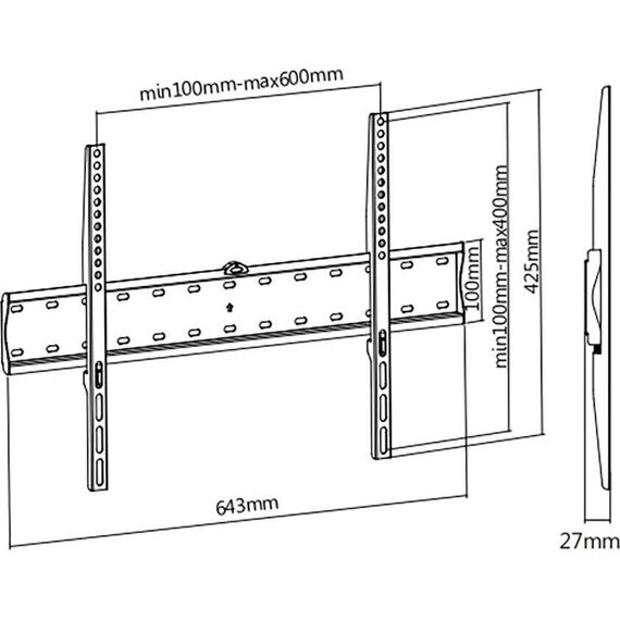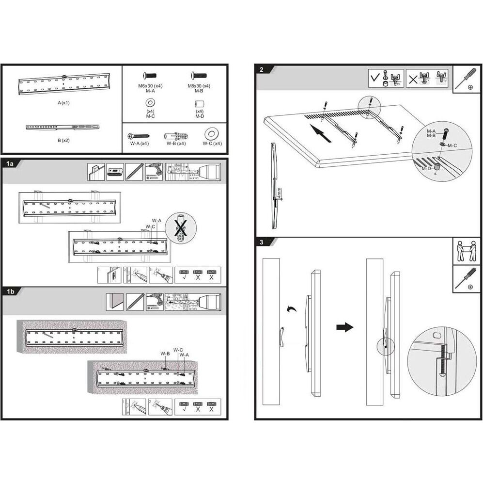 Материал: холоднокатаная сталь. Протестировано весом в 3 раза больше. Встроенный уровень. Простое в установке стильное и надёжное крепление. Диагональ экрана: 37"-75". VESA: 200x200, 300x300, 400x200, 400x400, 600x400. Нагрузка: до 40 кг.