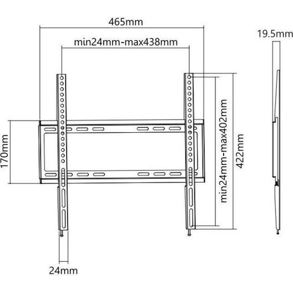 Диагональ экрана: 32"-55". VESA: 200x200, 300x300, 400x200, 400x400. Максимальная нагрузка: 35 кг. Расстояние от стены: 19,5 мм. Материал: холоднокатаная сталь. Протестировано весом в 4 раза больше. Ультра-тонкий дизайн. Открытая конструкция с улучшенной вентиляцией и облегчённым доступом к проводам. Можно перемещать вправо-влево. Фиксирующие винты.