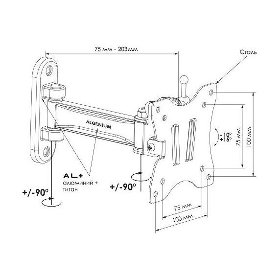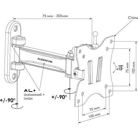 Тип: наклонно - поворотный, с вращением и складыванием, ugolот -10° до 15°povorot +/-90°, Диагональ: 15"-27" (38 см – 68 см), Стандарт VESA: 75*75, 100*100, Нагрузка макс: 15 кг, Цвет: черный.