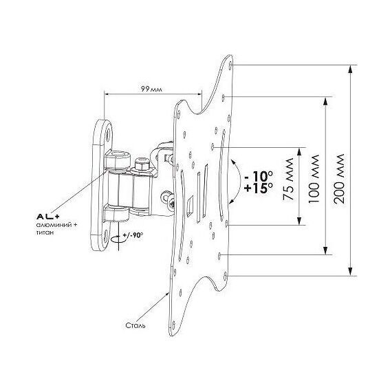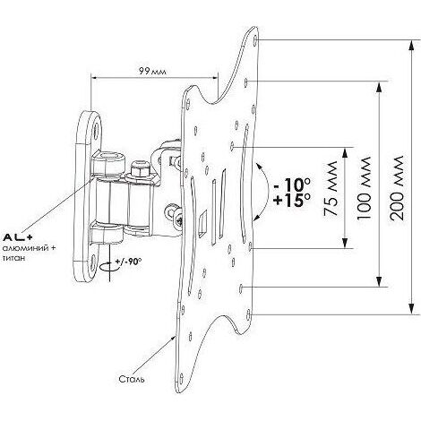 Тип: наклонно - поворотный, с вращением и складыванием, ugolот -10° до 15°povorot +/-90°, Диагональ: 23"-42" (38 см – 68 см), Стандарт VESA: 200*200, 200*100, 100*100, 75*75, Нагрузка макс: 20 кг, Цвет: черный.
