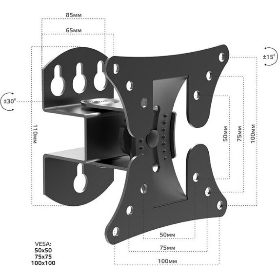 Тип кронштейна; наклонно-поворотный/ Максимальный вес ТВ - 20 кг/ 10-32 " Крепление стандарта Vesa; до 100х100/ Типы VESA; 75x75/100х100/ Угол наклона; +/-15°