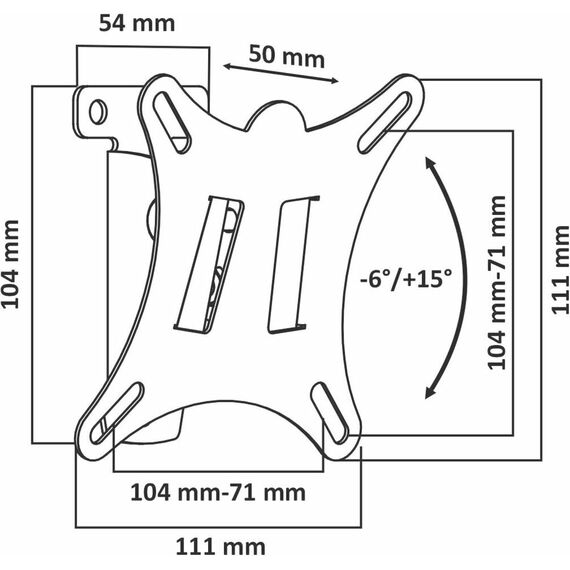 Наклонный Диагональ: 10"-32" (25-81см) Расстояние от стены: 50 мм Угол наклона: -6°/+15° Нагрузка: 25 кг Толщина металла адаптера 1,5 мм, основания 2 мм. Регулировка угал наклона без использования инструмента. Vesa 100*100.