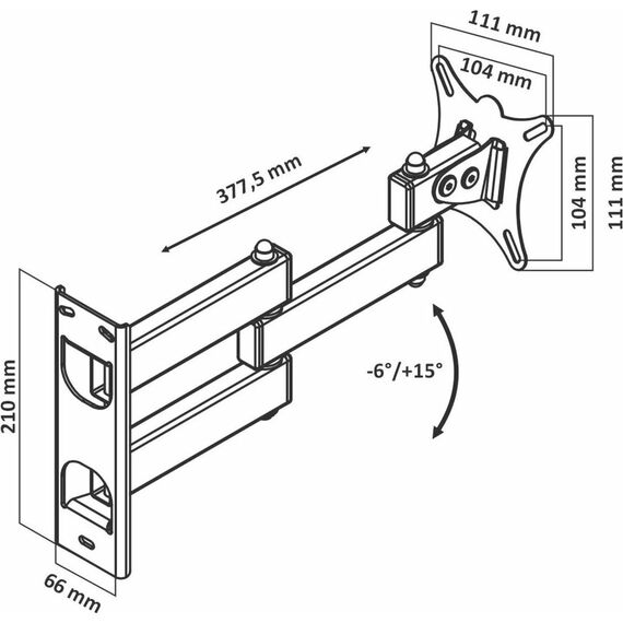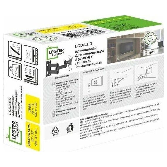 Наклонный-поворотный (Функц) Диагональ: 10"-32" (25-81см) Расстояние от стены: 117-383 мм Угол наклона: -6°/+15° Угол поворота: 350° Нагрузка: 25 кг Толщина металла адаптера 1,5 мм, основания 2 мм. Регулировка угла наклона и поворота без использования инструмента. Vesa 100*100.
