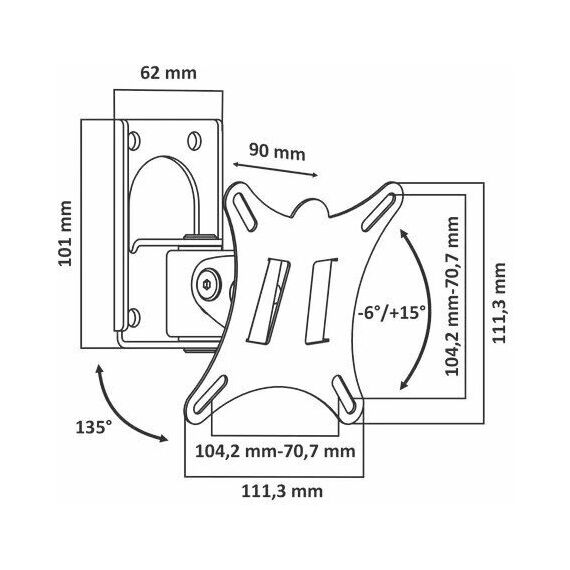 Наклонный-поворотный (Функц) Диагональ: 10"-65" (25-165см) Расстояние от стены: 60-110 мм Угол наклона: -6°/+15° Угол поворота: 135° Нагрузка: 25 кг Толщина металла адаптера 1,5 мм, основания 3 мм. Механизм "Шип-паз" Удобная фиксация "Гайка-барашек" Регулировка угла наклона и поворота без использования инструмента. 75*75, 100*100, 200*100, 200*200, 300*300,400*400.
