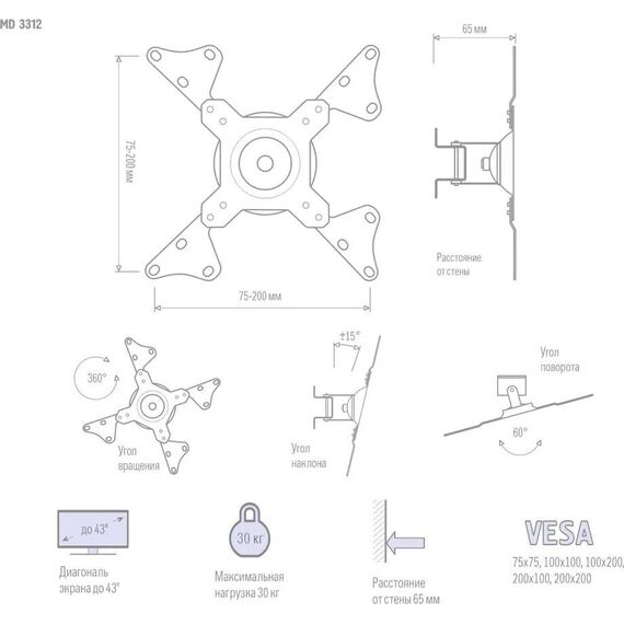 Тип кронштейна Наклонно-поворотный. Крепежные отверстия (VESA) 75x75, 100x100, 100x200, 200x100, 200x200. Мин. диагональ экрана (дюймы) 15. Макс. Диагональ экрана (дюймы) 45. Максимальная нагрузка, (кг.) 30. Угол наклона (°) 15. Угол повотора (°) 60. Вращение экрана (°) 360. Расстояние от стены (мм.) 65. Цвет кронштейна белый. Гарантия (лет) 2.