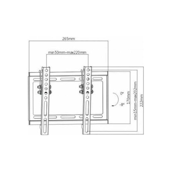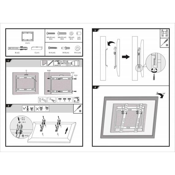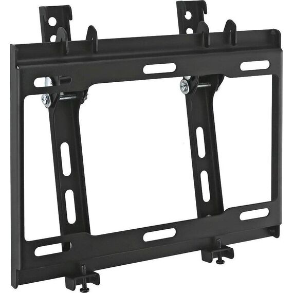 Диагональ экрана: 17"-43". Подходит для изогнутых телевизоров. VESA: 75x75, 100x100, 200x100, 200x200. Максимальная нагрузка: 35 кг. Расстояние от стены: 25 мм. Угол наклона: 0°~-14°. Цвет: черный. Материал: холоднокатаная сталь, пластик. Протестировано весом в 4 раза больше. Улучшенная вентиляция и облегчённый доступ к проводам. Конструкция свободного наклона. Уровень входит в комплектацию.