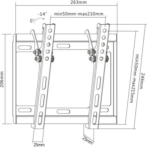 Диагональ экрана: 17"-43". Подходит для изогнутых телевизоров. VESA: 75x75, 100x100, 200x100, 200x200. Максимальная нагрузка: 35 кг. Расстояние от стены: 25 мм. Угол наклона: 0°~-14°. Цвет: белый. Материал: холоднокатаная сталь, пластик. Протестировано весом в 4 раза больше. Улучшенная вентиляция и облегчённый доступ к проводам. Конструкция свободного наклона. Уровень входит в комплектацию.