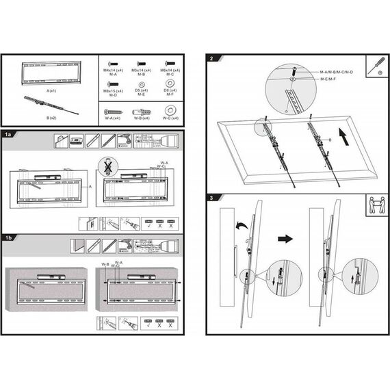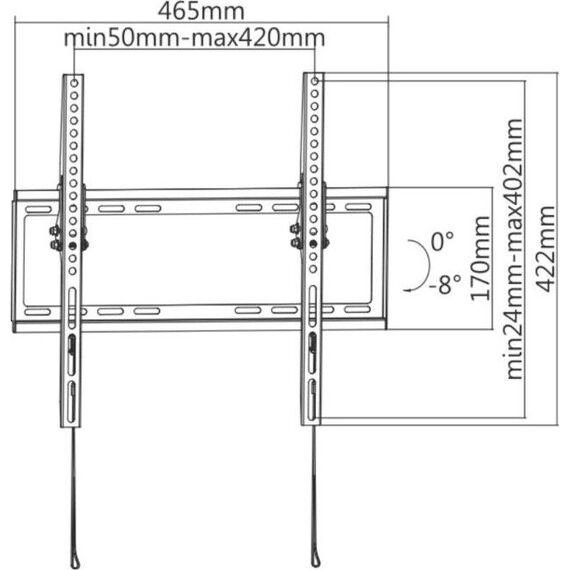 Диагональ экрана: 32"-55". VESA: 200x200, 300x300, 400x200, 400x400. Максимальная нагрузка: 35 кг. Расстояние от стены: 20,5 мм. Угол наклона: 0°~-8°. Материал: холоднокатаная сталь. Протестировано весом в 4 раза больше. Ультра-тонкий дизайн. Регулировка угла наклона. Открытая конструкция с улучшенной вентиляцией и облегчённым доступом к проводам. С помощью автоматических защёлок телевизор надёжно фиксируется на настенном крепеже и блокируется винтами.
