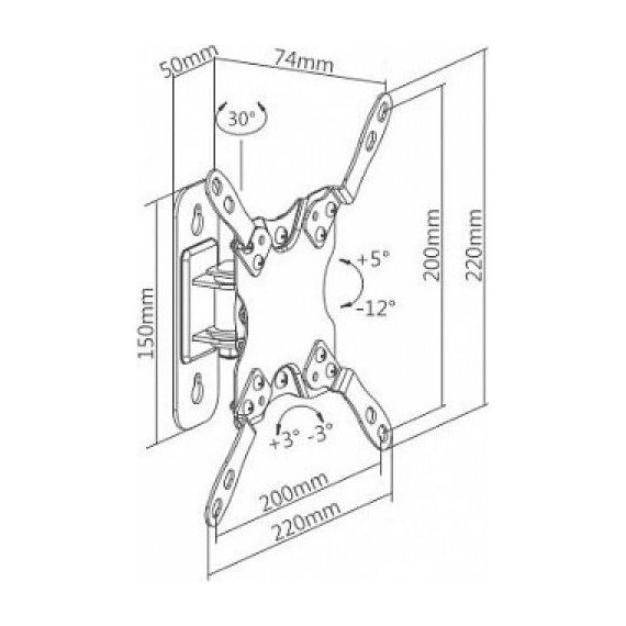 Наклонно-поворотный. Диагональ экрана: 13"-43". Подходит для изогнутых экранов. VESA: 75x75, 100x100, 200x100, 200x200. Максимальная нагрузка: 20 кг. Расстояние от стены: 74 мм. Угол поворота: +15°~-15°. Угол наклона: +5°~-12°. Горизонт экрана: +3°~-3°. Материал: холоднокатаная сталь. Протестировано весом в 2 раза больше максимально допустимого. Плавно и легко наклоняется и поворачивается. Конструкция свободного наклона. Встроенная регулировка уровня и индикатор поворота. Конструкция панели с VESA съёмная для лёгкой установки. Декоративные накладки для кабеля.