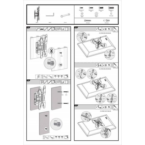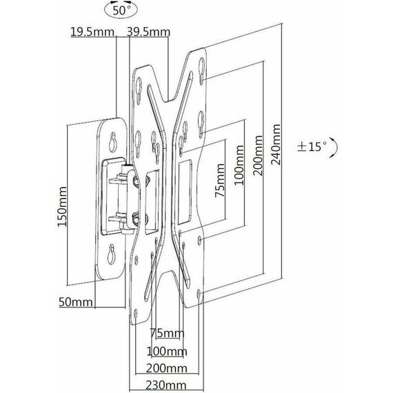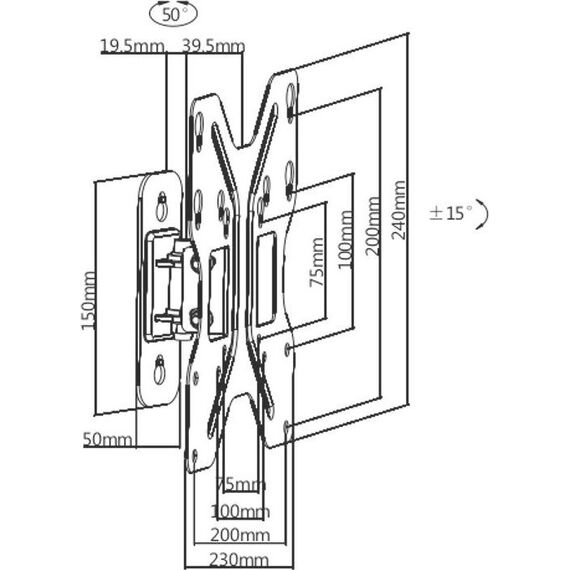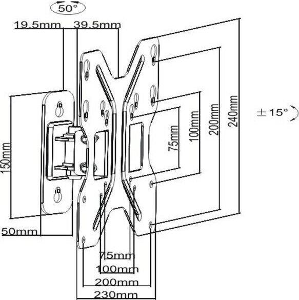 Диагональ экрана: 17"-43". VESA: 75x75, 100x100, 200x100, 200x200. Максимальная нагрузка: 30 кг. Расстояние от стены: 59 мм. Угол поворота: +25°~-25°. Угол наклона: +15°~-15°. Материал: холоднокатаная сталь, пластик. Протестировано весом в 3 раза больше максимально допустимого. Угол обзора легко регулируется. Конструкция свободного наклона.